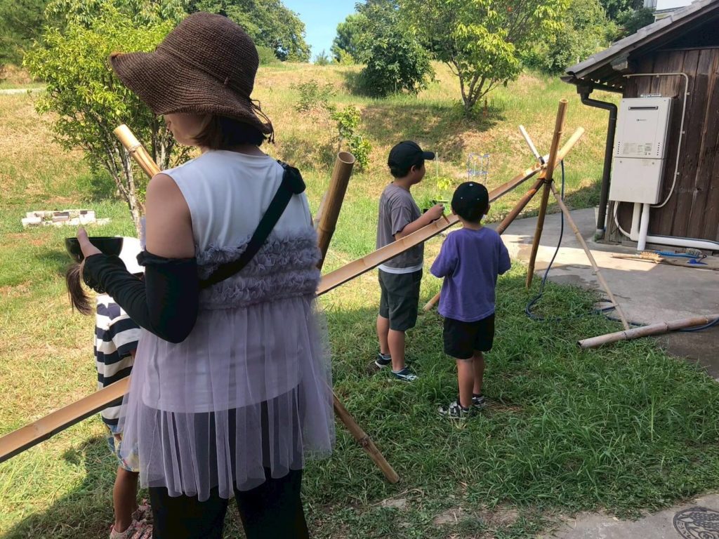 子どもたちには、流れてくるそうめんをただ食べるだけではなく、「そうめん流し」の組み立てから始めてもらいます。
